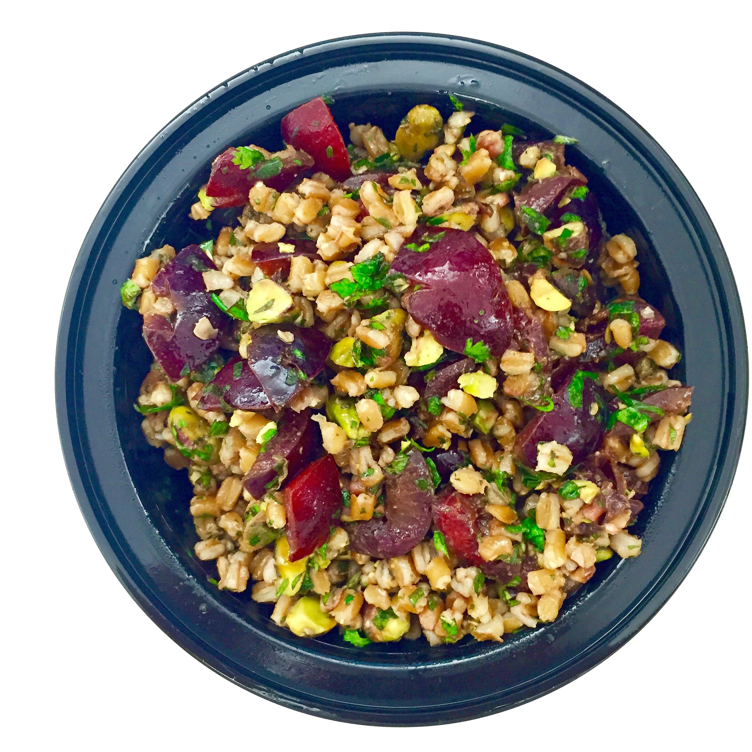 Now that all your prep is done, let's throw this bad boy together in about 2 minutes. Pull down a large mixing bowl and pour in the cup of cooked farro. Add the herbs, and cherries and mix. Then add the lemon juice, olive oil, some salt to taste, and the pistachios. Toss again. The farro absorbs the liquid in the dressing really well and doesn't get soggy so this will keep for a few days.