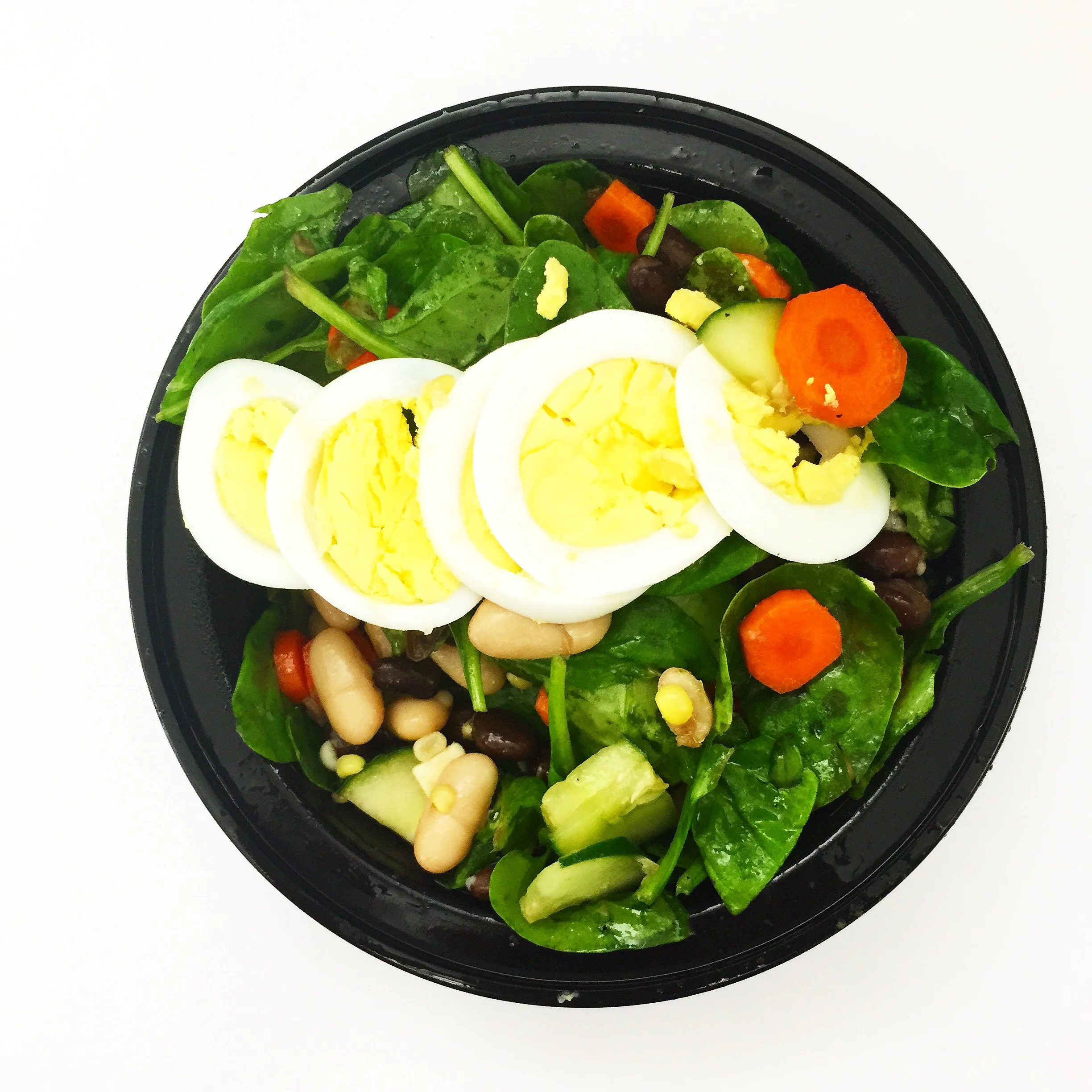Layer up some spinach and throw in the cucumber, both varieties of beans, carrot and cheese, in whatever quantity you deem appropriate.