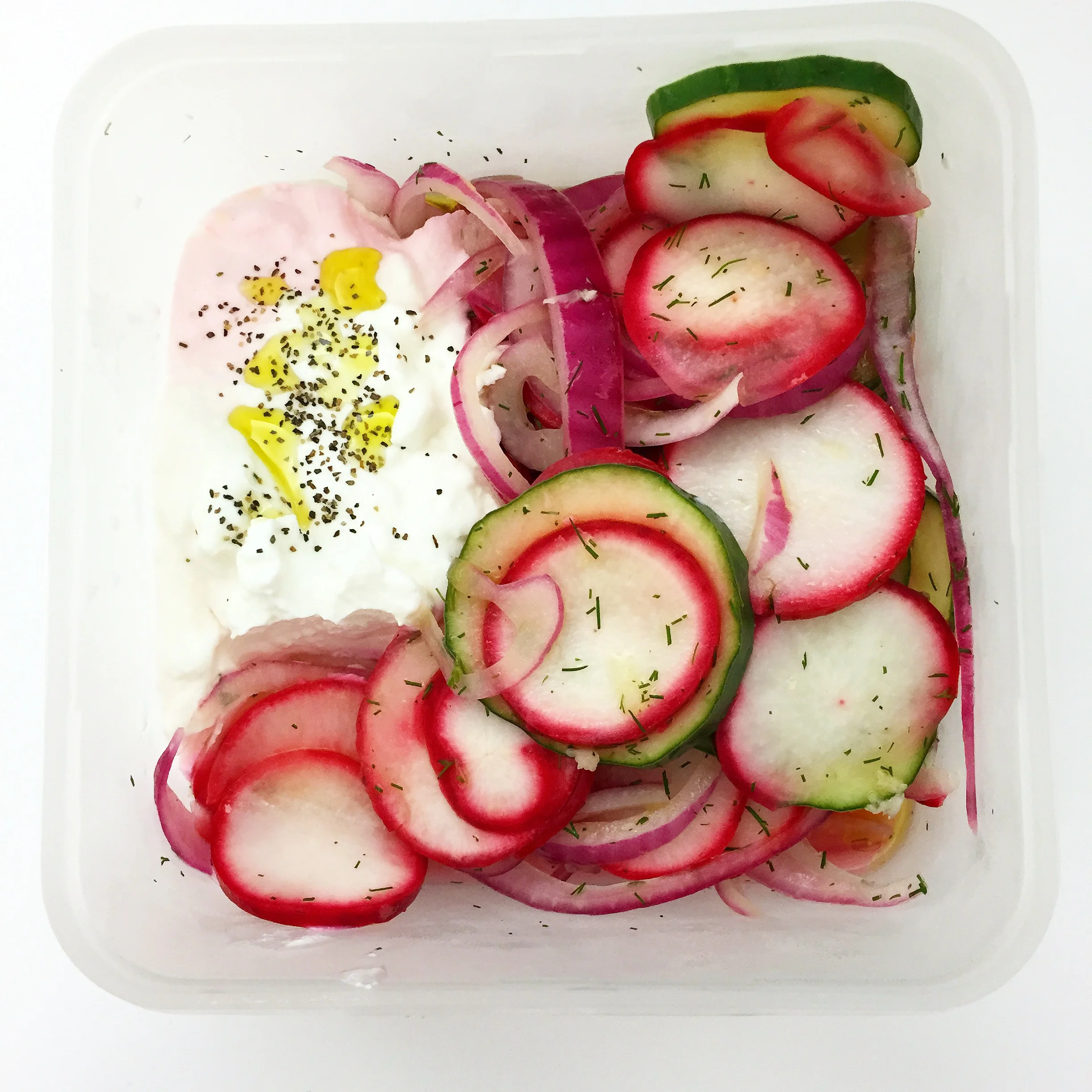 I wanted something that reminded me of that cucumber yogurt salad but that would make sense with the radishes as well. Simple solution? A quick pickle of the two using some white vinegar served over Greek yogurt.